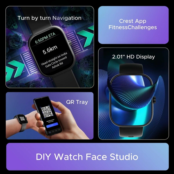 - Special Features: Turn-by-Turn Navigation, 2.01" HD Display, BT Calling, Crest+ OS, QR Tray, Watch Face Studio, Coins, Emergency SOS