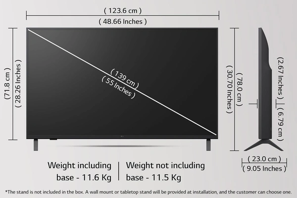 - Additional information: Brand Warranty can be availed using amazon invoice and User manual can be accessed from brand website | Included Components: 1 UHD TV, 1 Remote with 2AAA Batteries (Note: LG does not include a TV stand inside the box. A free wall mount or table-top stand will be provided and installed by LG’s technician during installation. Customers can choose one option at the time of service.)