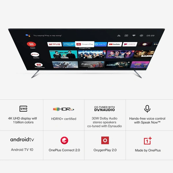 - Smart TV Features : Android TV 10 |Hands-free voice control with Speak Now | Google Assistant | OnePlus Connect 2.0 | OxygenPlay 2.0 | Data Saver Plus | Kids Mode | Game Mode