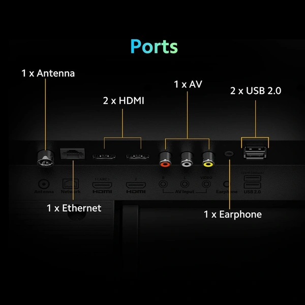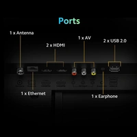 - Connectivity: Dual Band Wi-Fi (2.4 GHz/ 5 GHz) | 2 HDMI ports to connect set top box, gaming consoles, DVD or Blu-ray Players | 2 USB ports to connect hard drives and other USB devices | ARC | Bluetooth 5.0 | Ethernet | 3.5mm earphone Jack