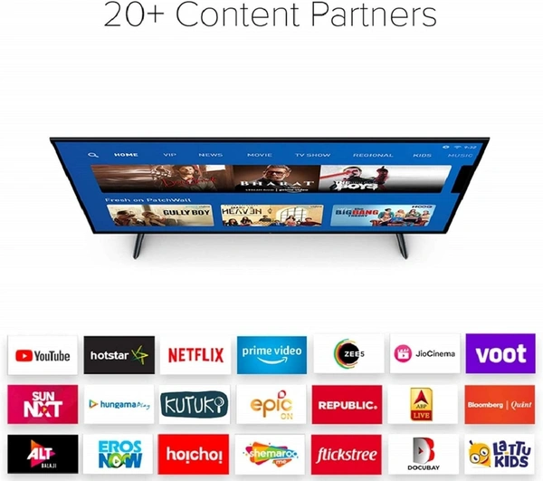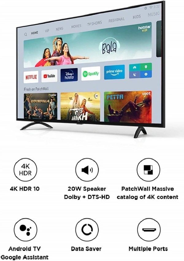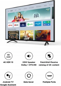 Smart TV features : Built-In Wi-Fi | PatchWall - Huge library of 4K content | Netflix + Prime video + Hotstar and 16 more content partners | Android TV | Google Assistant | Data Saver