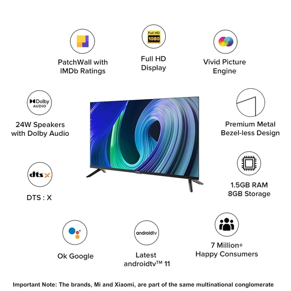 | Special Feature | Android TV 11 | PatchWall | IMDb Integration | Universal Search | 300+ Free Live Channels | Kids Mode with Parental lock | Smart Recommendations | Language Universe – 15+ Languages | User Centre | Okay Google | Chromecast suporting Apps : Netflix, Prime Video, Disney+ Hotstar | 5000+ apps from Play Store |Quad core Cortex A35 | Chromecast built-in | Ok Google | Auto Low Latency Mode | 1GB RAM + 8GB Storage |