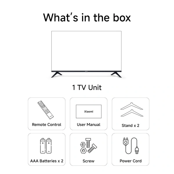 | Included Components | 1 LED TV, 1 Remote Control, 2 Stands Unit, 4 Screws, 2 x AAA batteries, 1 Power Cord |