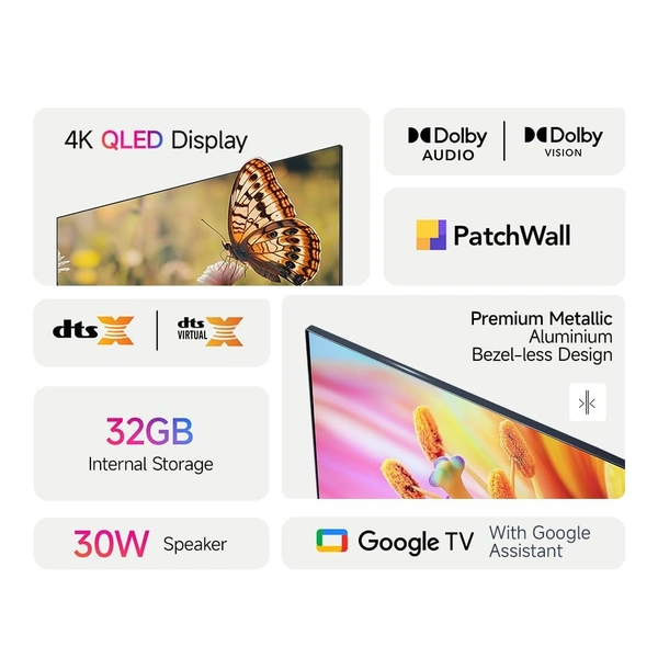 - Display: 4K HDR |QLED | Dolby Vision |HDR10 | HLG | Reality Flow MEMC | Vivid Picture Engine| ALLM