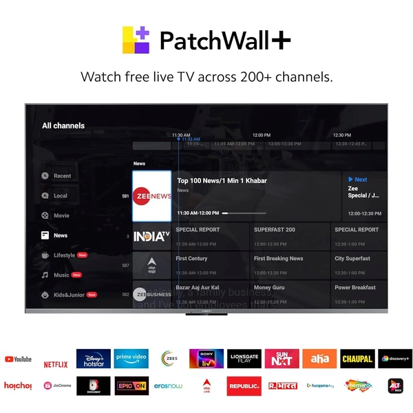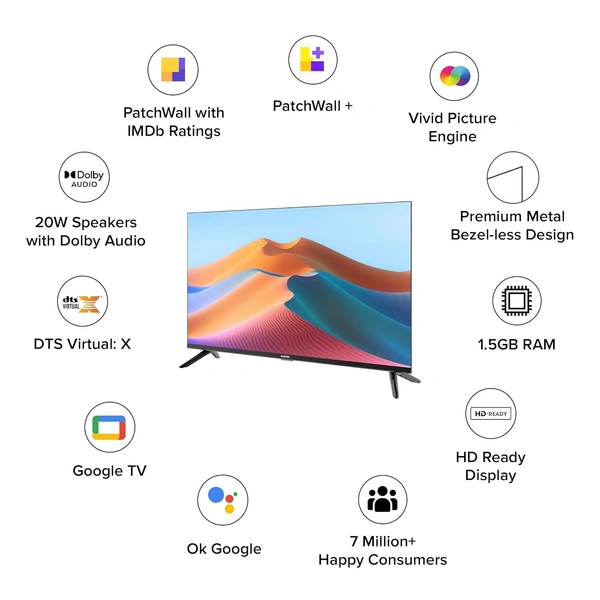 Hey Google | Google TV | HDR 10 | Supported Applications : PatchWall, PatchWall+, Netflix, Amazon Prime Video, Disney+ Hotstar, Miracast, Media player, Gallery, TV Manager, User Manual, Live TV, YouTube, YouTube Music, Play Store